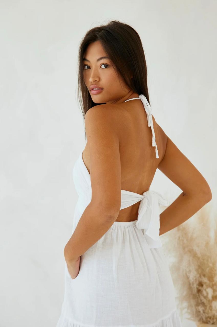The Carlotta Maxi Dress is made from a high quality natural cotton fabric. This maxi dress features an open back, halter tie at neck, and tie closure at back. The perfect piece for brunch!